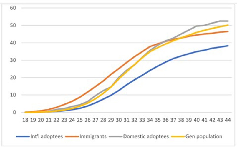 Bij niet-Europese immigranten trouwde men over het algemeen op jongere leeftijd, maar er waren ook hogere percentages scheidingen en hertrouwen. Mogelijk hangt dit samen met stress van immigratie en andere culturele normen, onder andere rond mannen en vrouwen. Het risico op scheiding van de immigranten lag lager dan dat van de geadopteerden, maar hoger dan dat van de algemene bevolking.