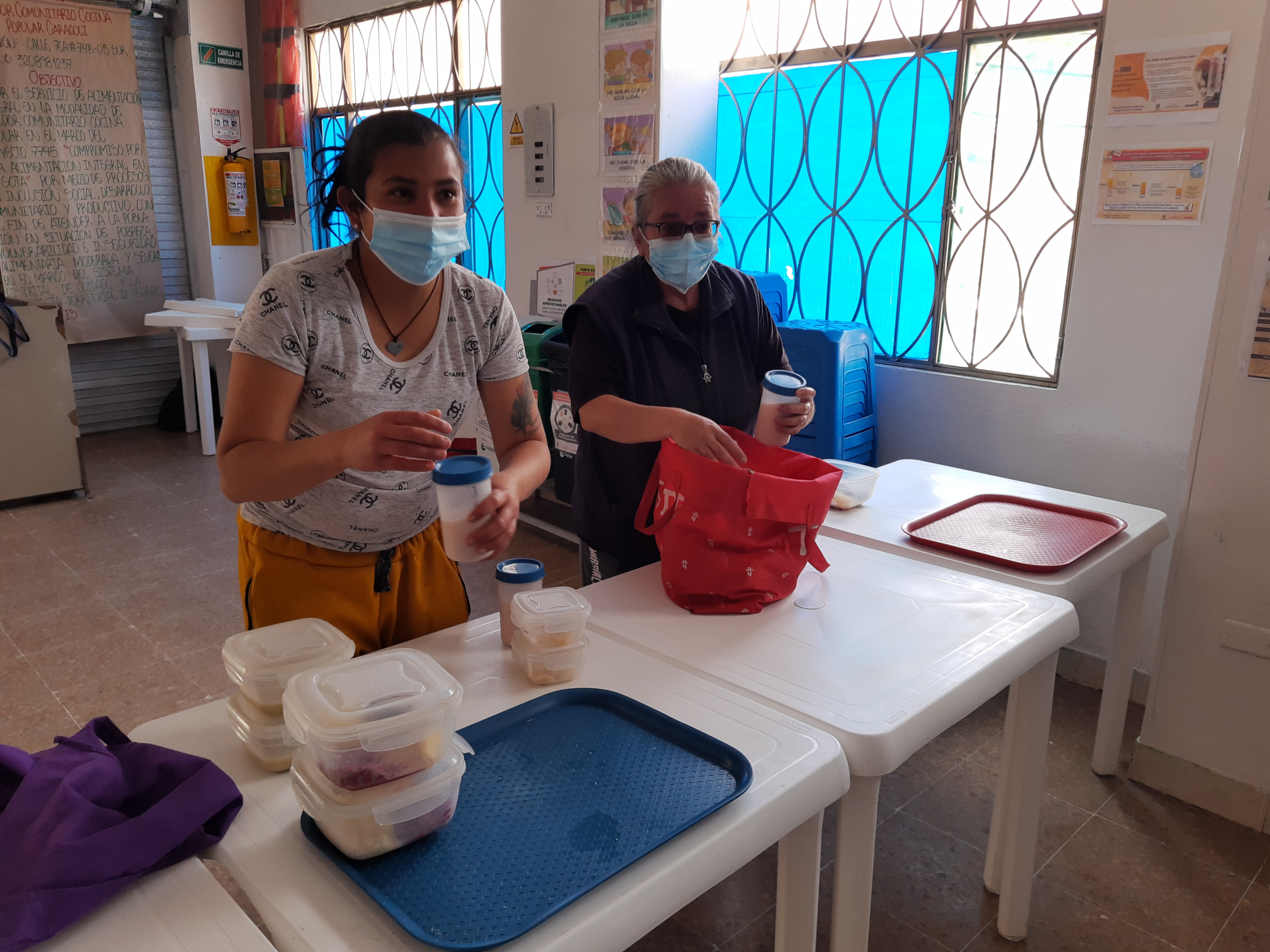 Beneden wordt er gekookt. Mensen die deelnemen aan het programma kunnen maaltijden afhalen. Een oma haalt bakjes eten af voor haar kleinkinderen. Een moeder voor haar twee zoontjes.