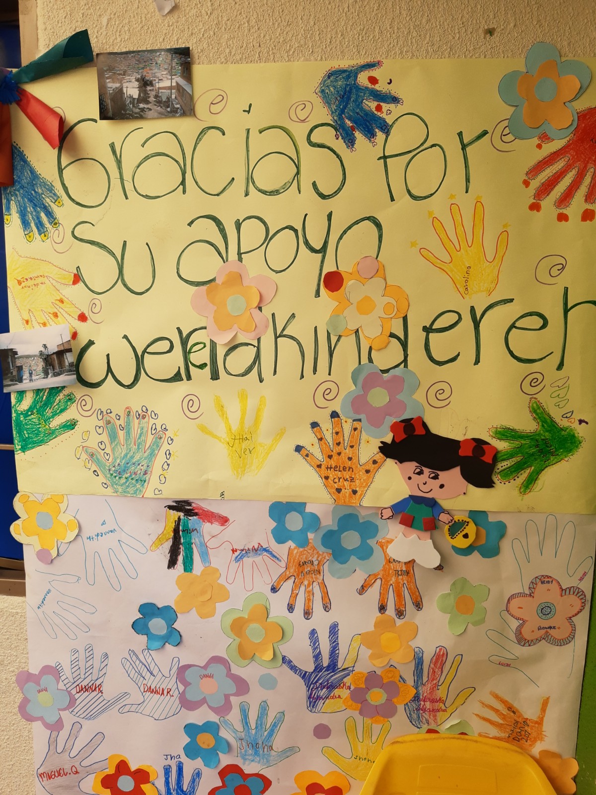 Als ik de ruimte binnen loop waar de kinderen worden opgevangen door de docente word ik ontvangen met een prachtige poster gemaakt door de kinderen waar op staat ‘Dankjewel voor jullie support Wereldkinderen’.